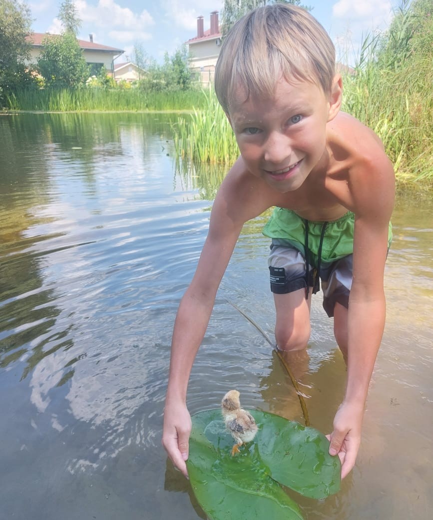 Но этот один... Настоящий боец! Дети оборудовали ему домик, поилку и кормушку, теплую грелочку, а позже и специальную лампу. Он быстро окреп и уже через пару дней бегал наперегонки за всеми, отмечал день ВМФ, плавал как уточка в речке вместе с мальчишками и жил свою лучшую жизнь.